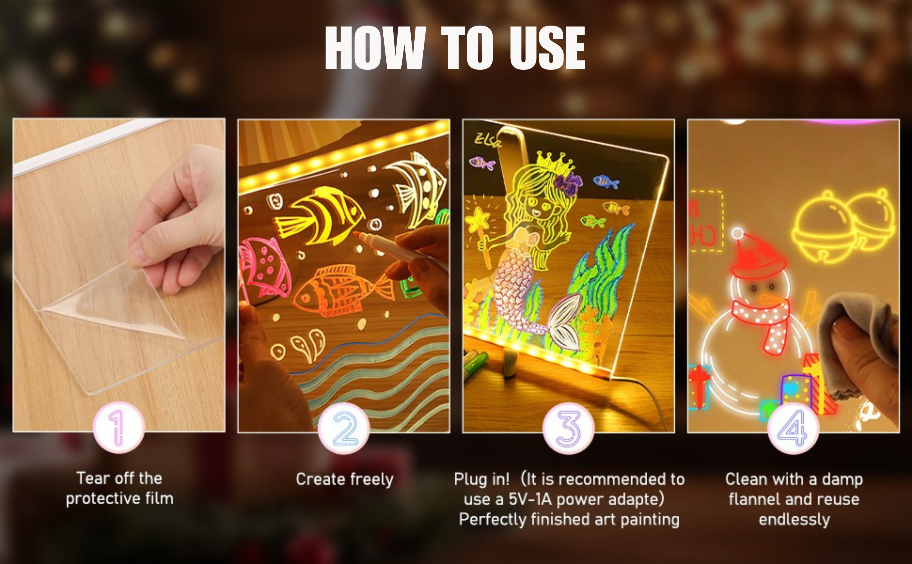 The board features built-in LED lights powered by a USB cable, which makes your writing glow beautifully.